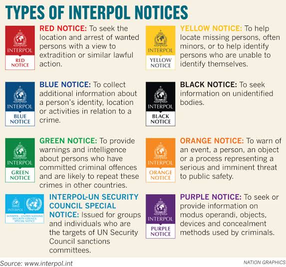 - There are seven types of notices — Red Notice, Yellow Notice, Blue Notice, Black Notice, Green Notice, Orange Notice, and Purple Notice.