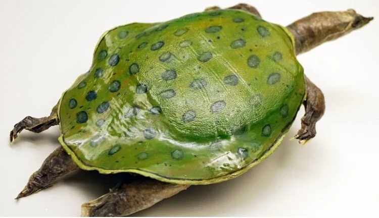 - Peacock Soft-shelled Turtle have a large head, downturned snout with low and oval carapace of dark olive green to nearly black, sometimes with a yellow rim.