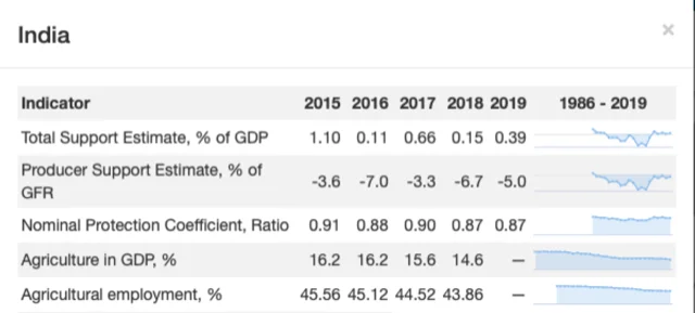 Across countries, the OECD provides five sets of data on the issue of agriculture support and India trails on most counts.