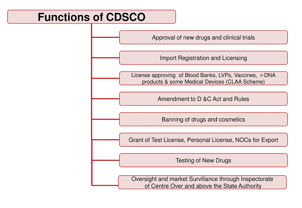 Major functions of CDSCO – Regulatory control over the import of drugs, approval of new drugs and clinical trials, meetings of Drugs Consultative Committee (DCC) and Drugs Technical Advisory Board (DTAB), approval of certain licenses as Central License Approving Authority is exercised by the CDSCO headquarters.