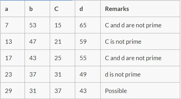 Using the equation (3), let us look for the prime values of a and b and the corresponding values of c and d using equation 2 and 1