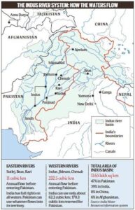 • Allocation of rivers: It prescribes how water from the six rivers of the Indus River System would be shared between India and Pakistan. It allocated the three western rivers Indus, Chenab and Jhelum to Pakistan for unrestricted use, barring certain non-consumptive, agricultural and domestic uses by India and the three Eastern rivers Ravi, Beas and Sutlej were allocated to India for unrestricted usage.