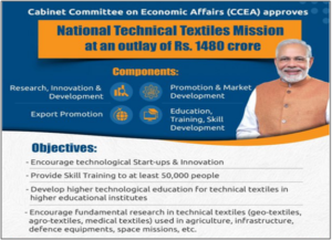 • Nodal ministry: NTTM is an initiative of the Ministry of Textiles to promote the growth and development of the technical textiles sector in the country.