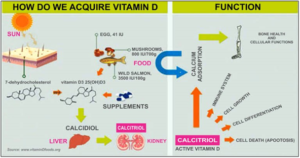 • Production: It is produced endogenously when ultraviolet (UV) rays from sunlight strike the skin and trigger vitamin D synthesis. During periods of sunlight, vitamin D is stored in fat and then released when sunlight is not available.