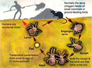 - Transmission: It is not directly communicable from person to person. Instead, it is a zoonotic disease that is transmitted to humans through the bite of infected chiggers (young mites).