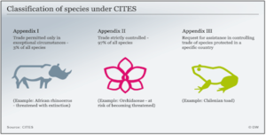 - Appendix I: It includes species threatened with extinction and provides the greatest level of protection, including a prohibition on commercial trade.