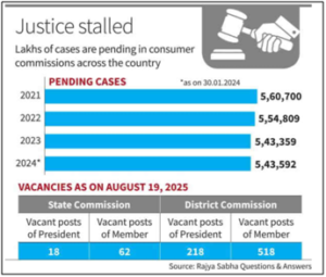 - Severe Vacancies in Consumer Commissions: As of August 19, 2025, official data shows 18 President posts and 62 Member posts vacant in State Commissions, and 218 Presidents and 518 Members vacant at the district level. The Parliamentary Standing Committee on Consumer Affairs has repeatedly flagged vacancies as the single largest contributor to pendency.