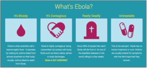 - Transmission: It spreads in the human population through direct contact with the blood, secretions, organs, or other bodily fluids of infected people and with surfaces and materials contaminated with these fluids. Ebola cannot be transmitted by air.