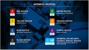 - Red Notice: To seek the location and arrest of a person wanted by a judicial jurisdiction or an international tribunal with a view to his/her extradition. It is the “closest instrument to an international arrest warrant”.