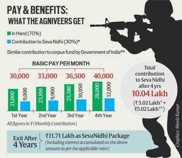 - Seva Nidhi Programme: Importantly, during this period, 30 per cent of their salary will be set aside under a Seva Nidhi programme, and the government will contribute an equal amount every month, and it will also accrue interest. At the end of the four-year period, each soldier will get Rs 11.71 lakh as a lump sum amount, which will be tax-free.